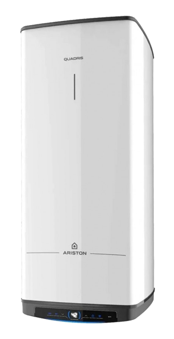 QUADRIS WiFi — компактний «квадратний» бойлер для економії місця та сучасного керування. Розрахований на швидке нагрівання і комфортне користування, тому може замінювати більші старі баки (виробник заявляє можливість заміни до ~250 л). Підтримує дистанційне керування через Ariston NET і має функцію ECO EVO для зниження енергоспоживання.
