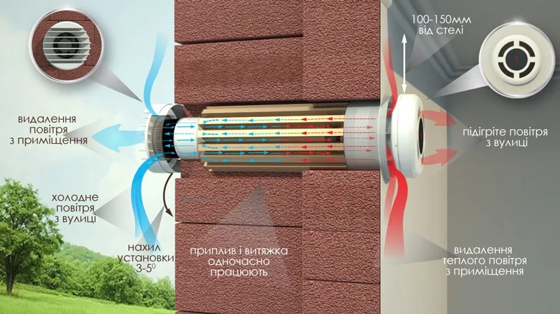 - Швидкість та простота монтажу: робиться наскрізний отвір на вулицю, в який на монтажну піну або інший ущільнювач встановлюється робочий модуль, видимими залишаються лише вентиляційні решітки - одна всередині приміщення, інша - на фасаді